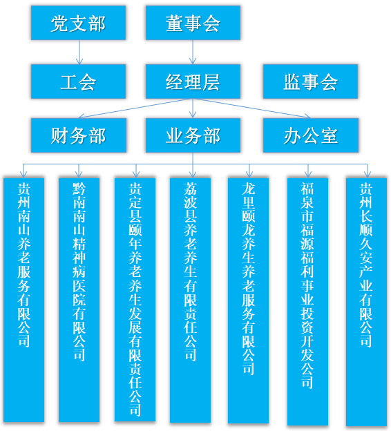公司情況:公司內(nèi)設(shè)部門7個(綜合部、財務(wù)部、采購部、審計部、業(yè)務(wù)一部、業(yè)務(wù)二部、業(yè)務(wù)三部)。下轄6家全資子公司:貴州南山健康產(chǎn)業(yè)公司、貴州云健康瑞公司、貴州長順久安產(chǎn)業(yè)公司,貴定頤年養(yǎng)老養(yǎng)生公司,荔波養(yǎng)老養(yǎng)生公司,龍里養(yǎng)生養(yǎng)老公司;6家控股子公司:南山精神病醫(yī)院公司、云健智慧城市管理公司、云健醫(yī)藥公司、云健泰萊醫(yī)學檢驗公司、云健健康監(jiān)測公司、福泉投資開發(fā)公司。